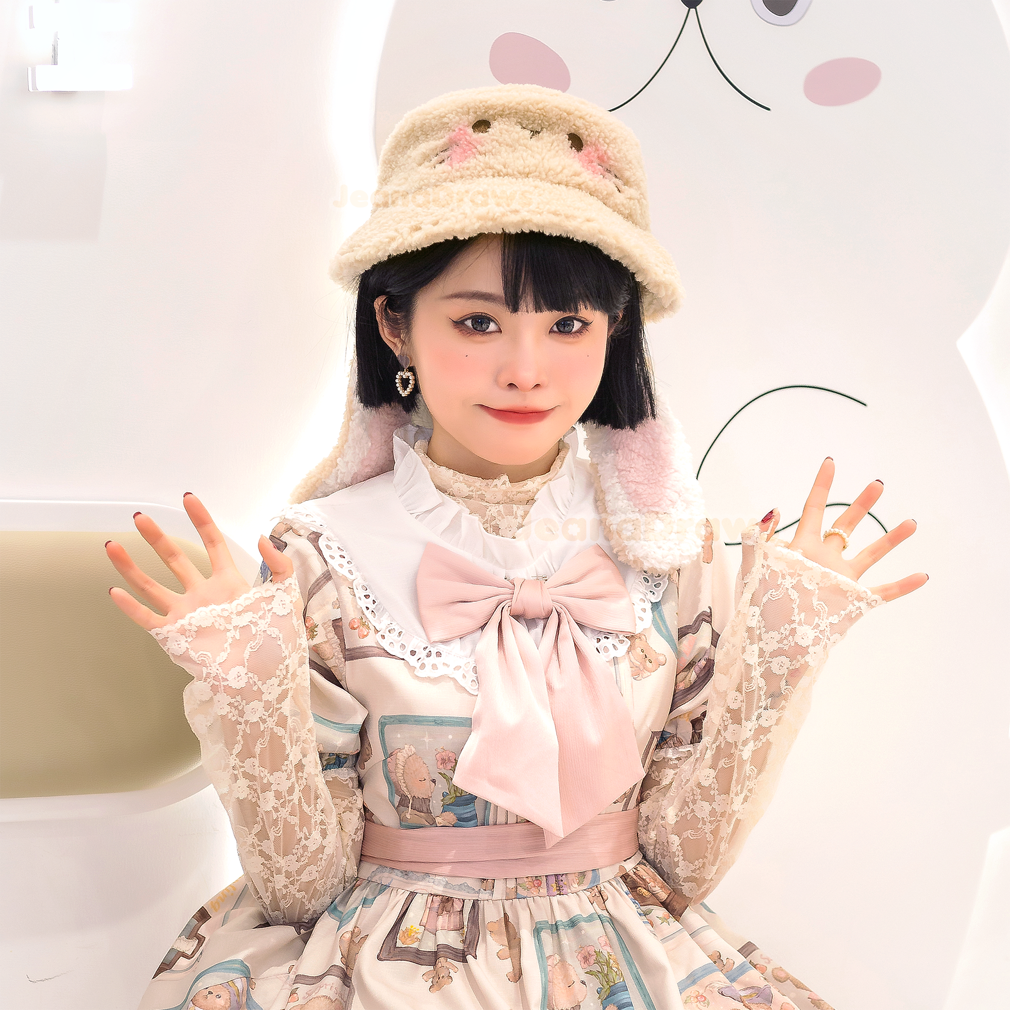 An adorable, fluffy bunny ear bucket hat! These bucket hats will add a sprinkle of cute to any outfit with their soft fluffy appearance and floppy bunny ears~
